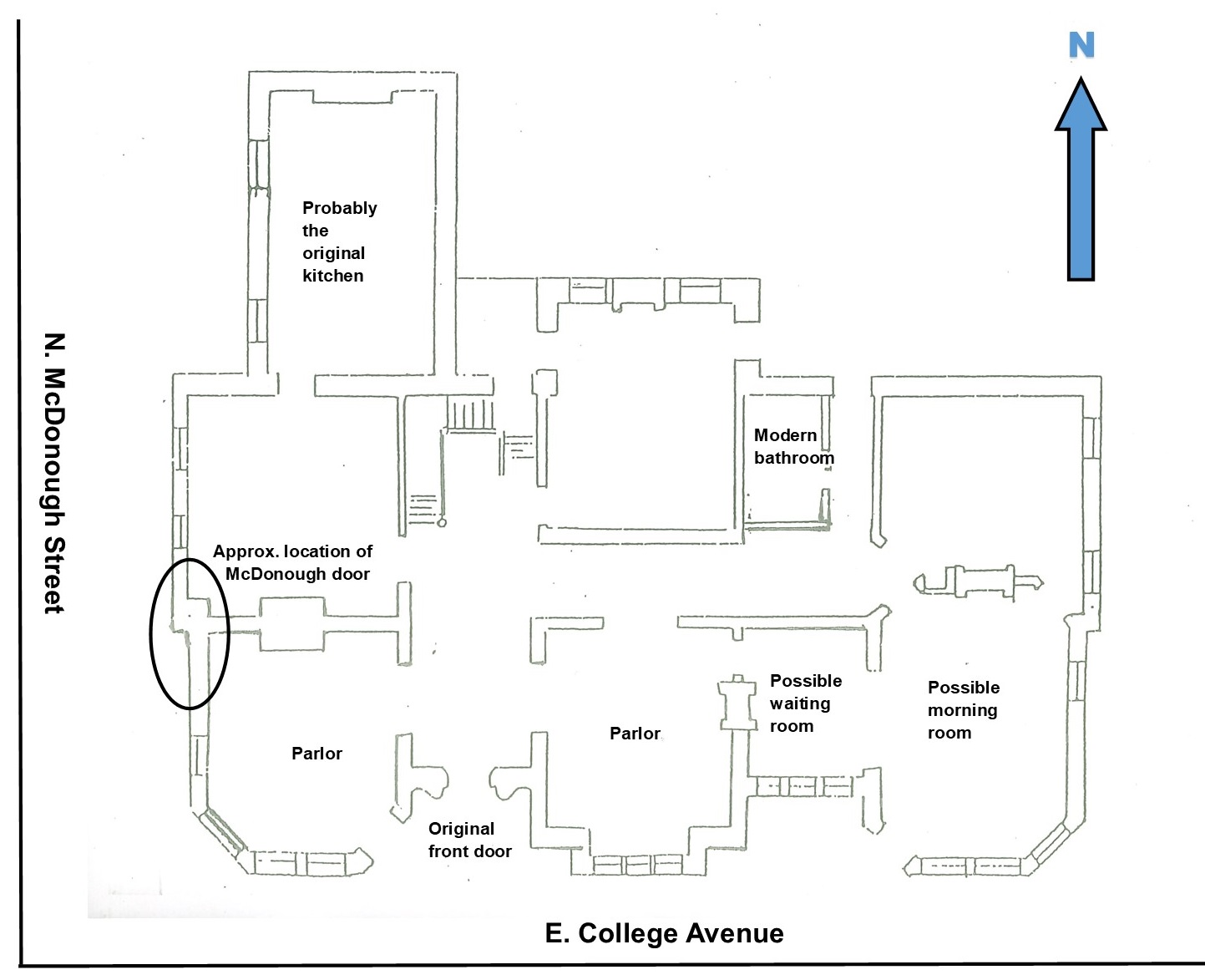The first new bungalow was built in “front” of the Marble House around 1925. This was likely when a large entry door was added on the side of the house to create a new front door onto McDonough Street. This would have resulted in some substantial interior changes to the house because the new door was placed where an interior wall and two fireplaces had been. The McDonough front door is seen in two 1960s photos from the Gaines family but has since been removed. By 1943, the house (now 119 N. McDonough Street) had been divided into seven apartments with Ruth Gaines Snellings’ family occupying one, and her dad, Milton Gaines, in another. It appears that the other five apartments were rented to people outside the family. The Gaines daughters sold the house in 1973; and until 1985, the house was rented out as six separate apartments, including one to Ruth Gaines Snellings.