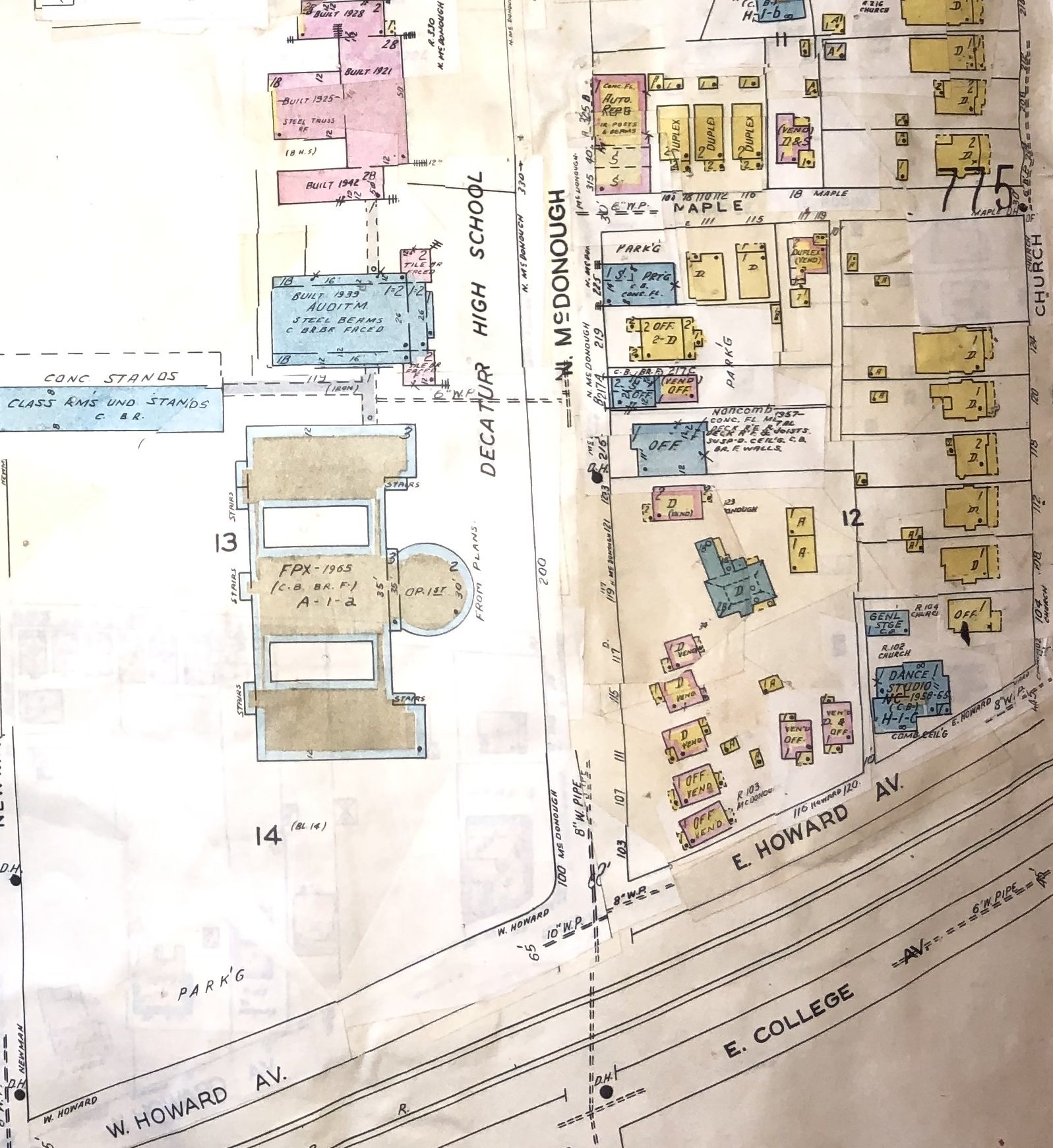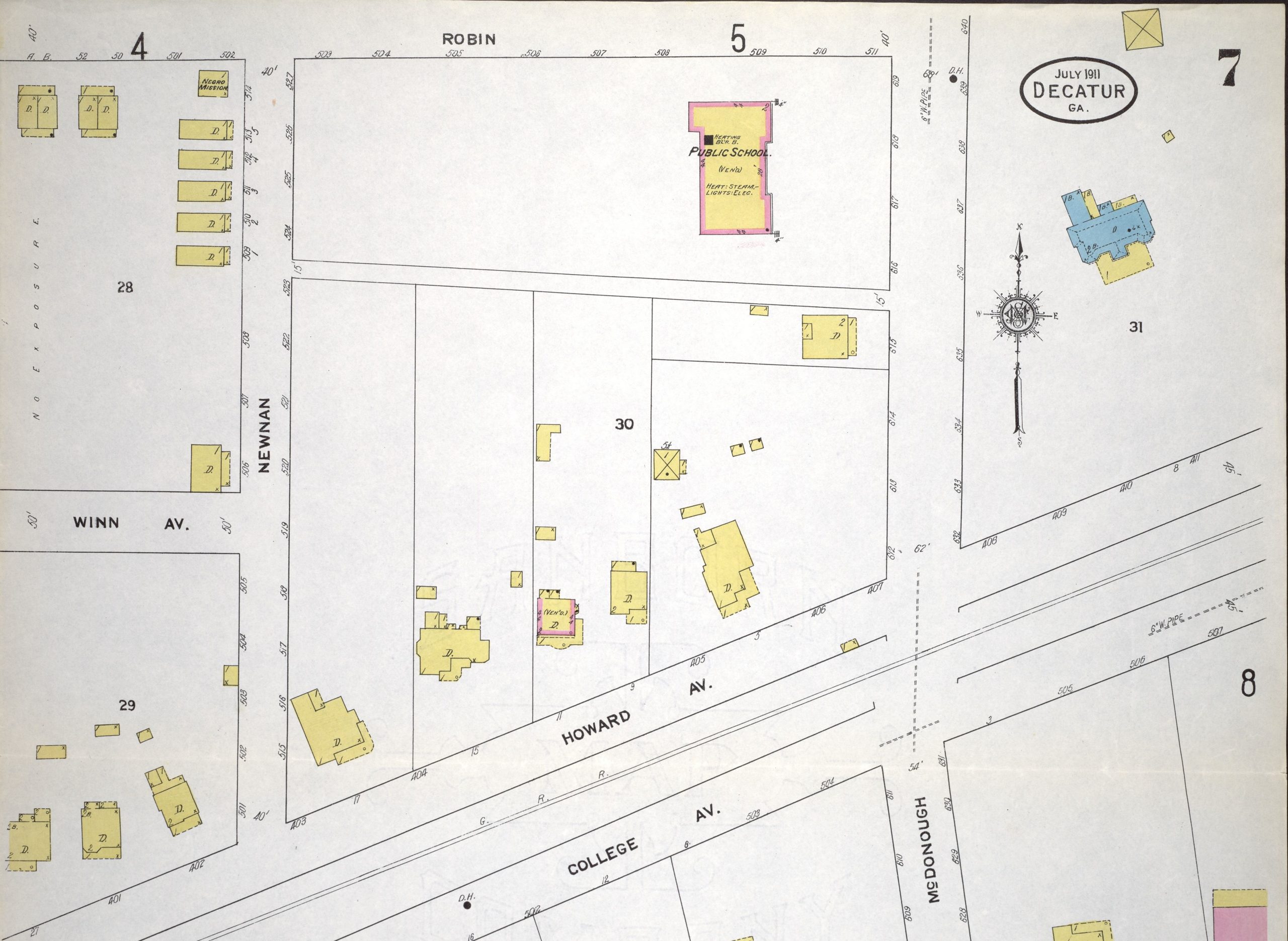 - Sanborn Maps: These maps were created to help assess risk for fire insurers and contain a wealth of information about some historic buildings. A more in-depth article on Sanborn Maps will be posted in the future. In the meantime, here are three images that show the Marble House and its environs in 1911, 1924, and about 1962. The Marble House is identified as “stone” by its blue color. As primary resources, there are occasionally some slight mistakes on the maps. This house is actually stucco over brick and Sanborn Maps do have a way to indicate an adobe veneer over a different construction material. I think this wasn’t noted as the Marble House’s technique was rare for this area. Yellow indicates frame construction, which you see on its porches as well as most of the dwellings (“D”) around the Marble House. The “x” on any structure indicates a wood shingle roof and the “0” indicates a non-combustible roof covering including metal or tile. “B” is for basement and the numbers indicate how many stories a structure has. The 1911 and 1924 maps are from the University of Georgia and are online via the Digital Library of Georgia. The circa 1962 version is a book in our DeKalb History Center Archives. Its bottom layer is a 1924 book. Changes were made by hand over time. Updates were cut and pasted into the book and are collectively so minute, they are not individually dated.