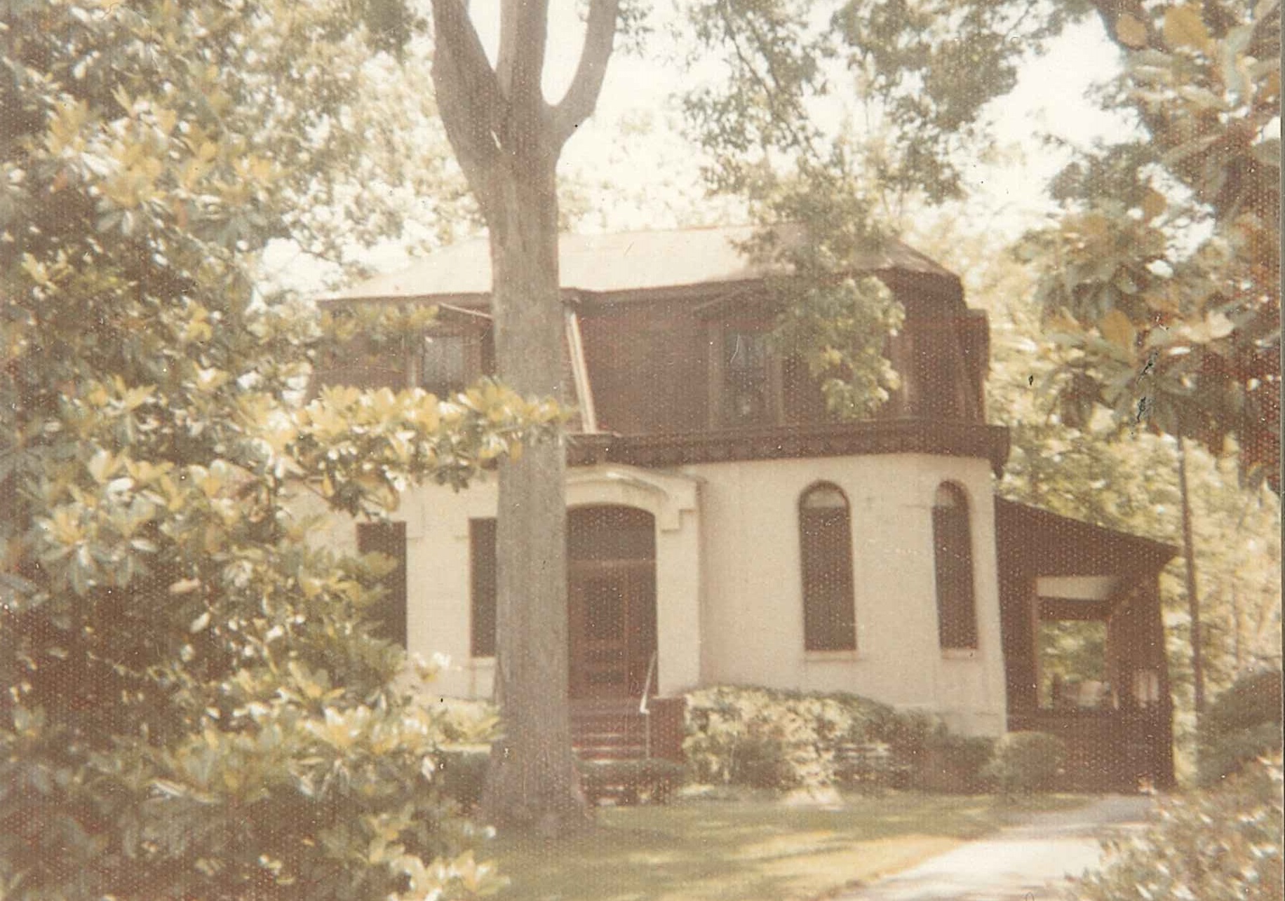 The symmetrically balanced façade was missing its large one-story wood front porch when the house was restored in 1985. Historic photos show two different versions, and the house was restored with porch columns similar to those seen in the Agnes Scott picture. The 1985 restoration underplayed the size and decorative nature of the original front porch – but there were no remaining details to copy. I would have expected more substantial columns and some decorative gingerbread trim. The current owner has a photo from the 1920s that shows a large screened porch with plain Doric columns set on plinths. A later photo shows a plain remodeled porch in the background.
