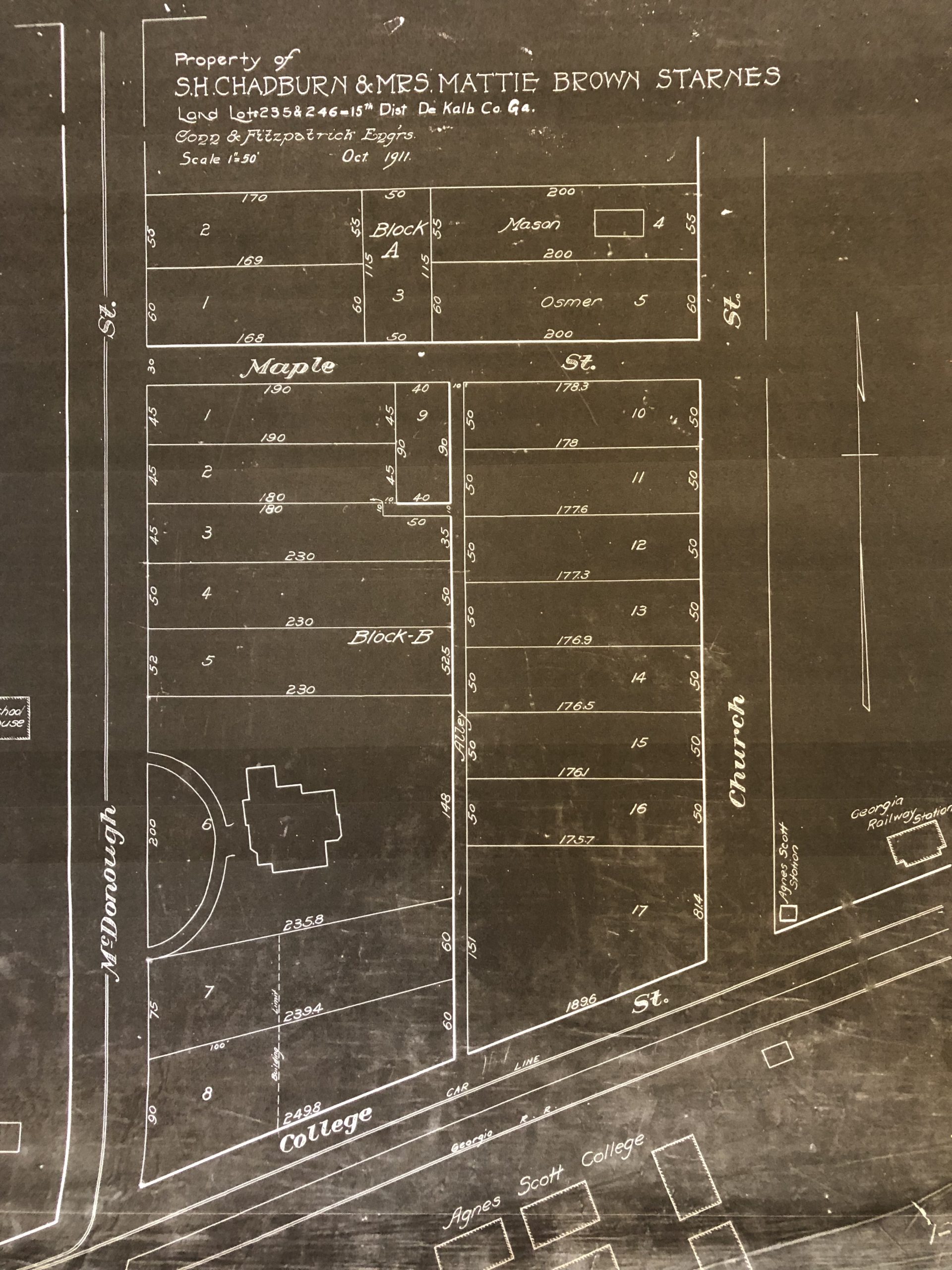 Mr. Walter died in 1888. As his estate was being settled, it was reported that he owned forty acres in Decatur. The property was soon sold to Frank J. Ansley, and the Marble House was briefly used by Agnes Scott College as a dining hall and student dormitory (1890 – 1891). Frank sold slightly less than half of the land, including the house, to his brother, Edwin P. Ansley. Edwin later left this mansion to move into Ansley Park in Atlanta, which he developed. When he began marketing this estate for sale in 1909, he proposed subdividing the remaining Marble House parcel into 15 lots – one of which preserved the integrity of the Marble House with its front unobstructed and facing the railroad tracks. It did not sell this way. Instead, the entire block was split in two (creating an alley from College Street to East Maple), with Edwin keeping the western side. In 1913, he sold his three remaining lots, with the house, to J. W. Glass. Since all of the lots on either side were oriented to face North McDonough, the Marble House no longer “fronted” the railroad tracks. Eventually five small brick clad bungalows were built on the two lots between the Marble House and College Avenue.