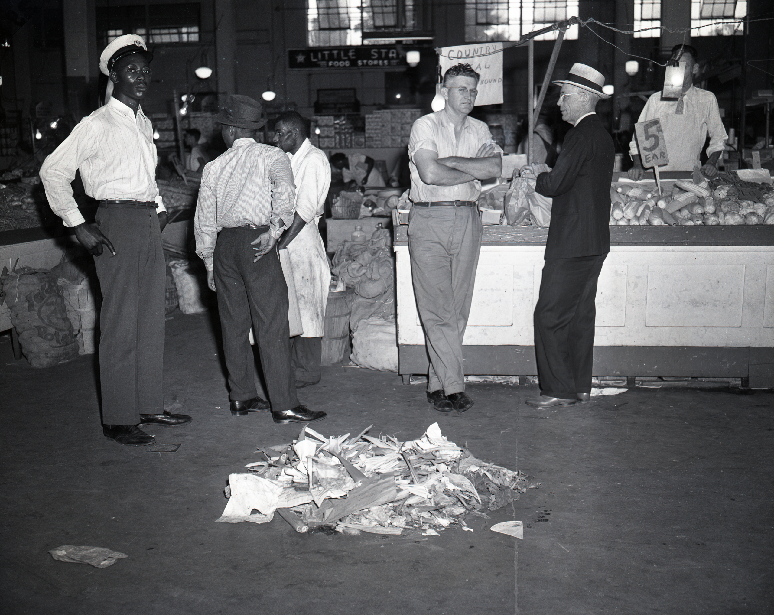 Inside Atlanta Municipal Market (Sweet Auburn Curb Market) ca. 1946. This series of photos shows the condition of the market. We are able to date this photo by looking at the discarded newspaper. Guy Hayes Collection, DeKalb History Center.