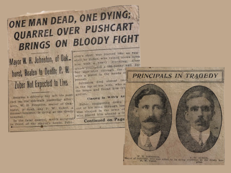What I hadn’t expected to find while looking through all of the family memorabilia and social news was a group of articles about a horrific incident in Oakhurst on September 24, 1911. The headline reads “One Man Dead, One Dying: Quarrel Over Pushcart Brings On Bloody Fight.” There was an incident between the Mayor of Oakhurst at the time, W. H. Johnston, and a grocer, P. W. Zuber, who had left a grocery cart in the street outside of Johnston’s home in Oakhurst. When the cart wasn’t moved in a timely fashion, Johnston kicked it and spilled all of the contents onto the ground. A fight ensued and Johnston was killed. Zuber was shot and managed to make it to a nearby hospital. I suppose the story hit close to home for Emma and she decided to preserve it in one of her scrapbooks.