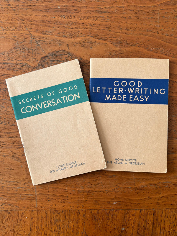 Recently I dove into a miscellaneous box, eager to come across something unseen and full of mysteries. Two booklets, Secrets of Good Conversation and Good Letter-Writing Made Easy were first to pique my interest. Inside, the booklets feature helpful tips on each topic, for example the importance of speaking in a pleasant voice, avoiding pretentiousness, and how to differentiate ‘thank you’ letters versus congratulatory letters. In the back of the booklet there is a list of all the booklets offered through the Home Service Department back in 1937 including Self-Introduction to Ballroom Dancing, How to Win and Hold Love, and Overcoming “Nerves” and Every-Day Health Problems.