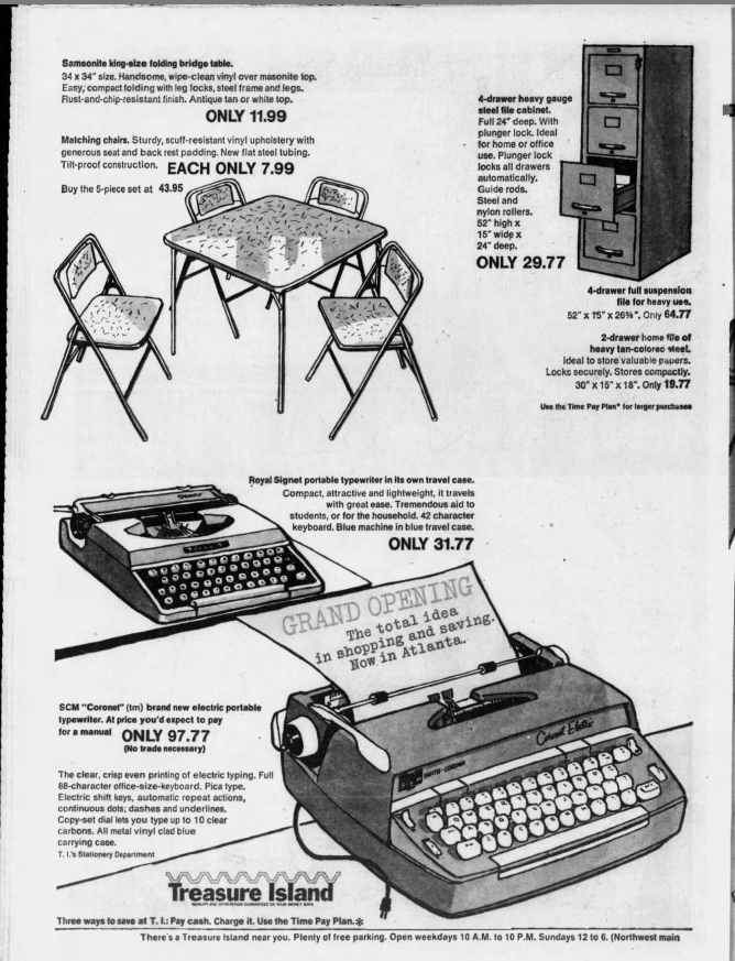 Treasure Island, or The Treasury (in some states), was a chain of discount department stores that offered groceries, consumer goods, beauty salon, drugstore, photo studio, dry cleaning, and auto and garden centers. The stores were 200,000 square feet (60,000 square feet larger than the average Costco!) and the four metro Atlanta locations employed 1,900 people. The cost for building the first three stores was $17,000,000.