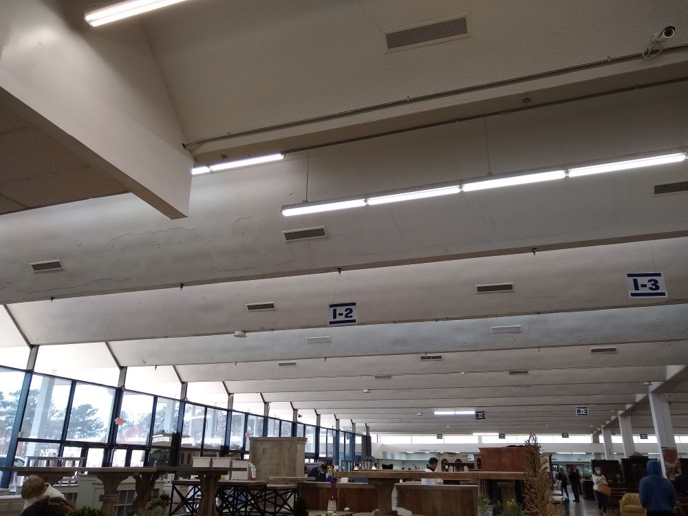 The interior of this location has barely changed since its grand opening in 1968. The lights were originally more concealed in the corner of the ceiling fold. Today, looking at the ceiling and the vast geometric lines it is overwhelming, vast, and dizzying. Despite the lack of skylights, the lights reflect down the fold of the ceiling, created an illusion of skylights. The original fluorescent lights were blinding, according to those that remember shopping at T.I.