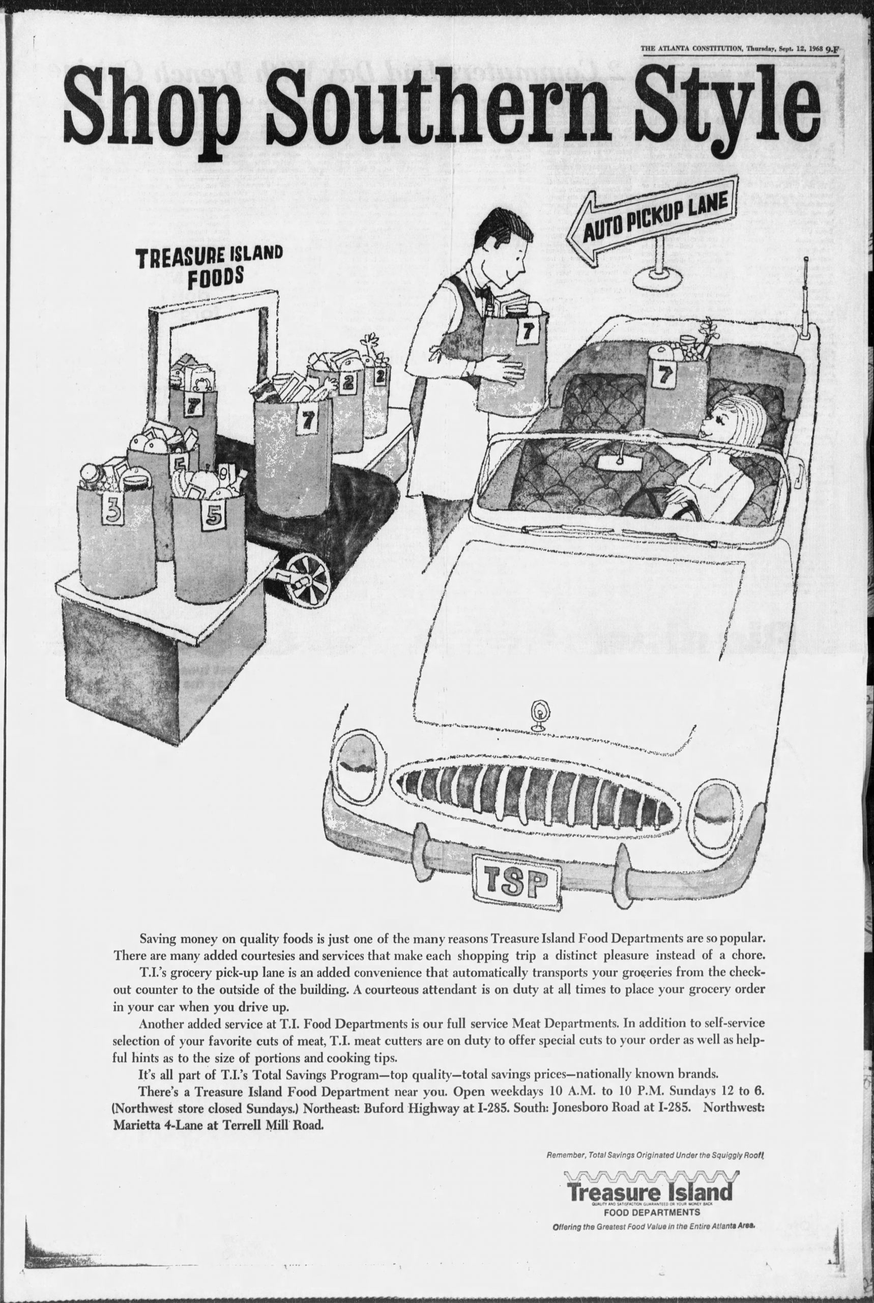 Parcel pick up in 1968. The original contactless grocery pick up. This ad shows the conveyer belt system for delivering goods. This was a favorite of young T.I shoppers who would get a kick out of this “magic”. Atlanta Constitution, September 1968.