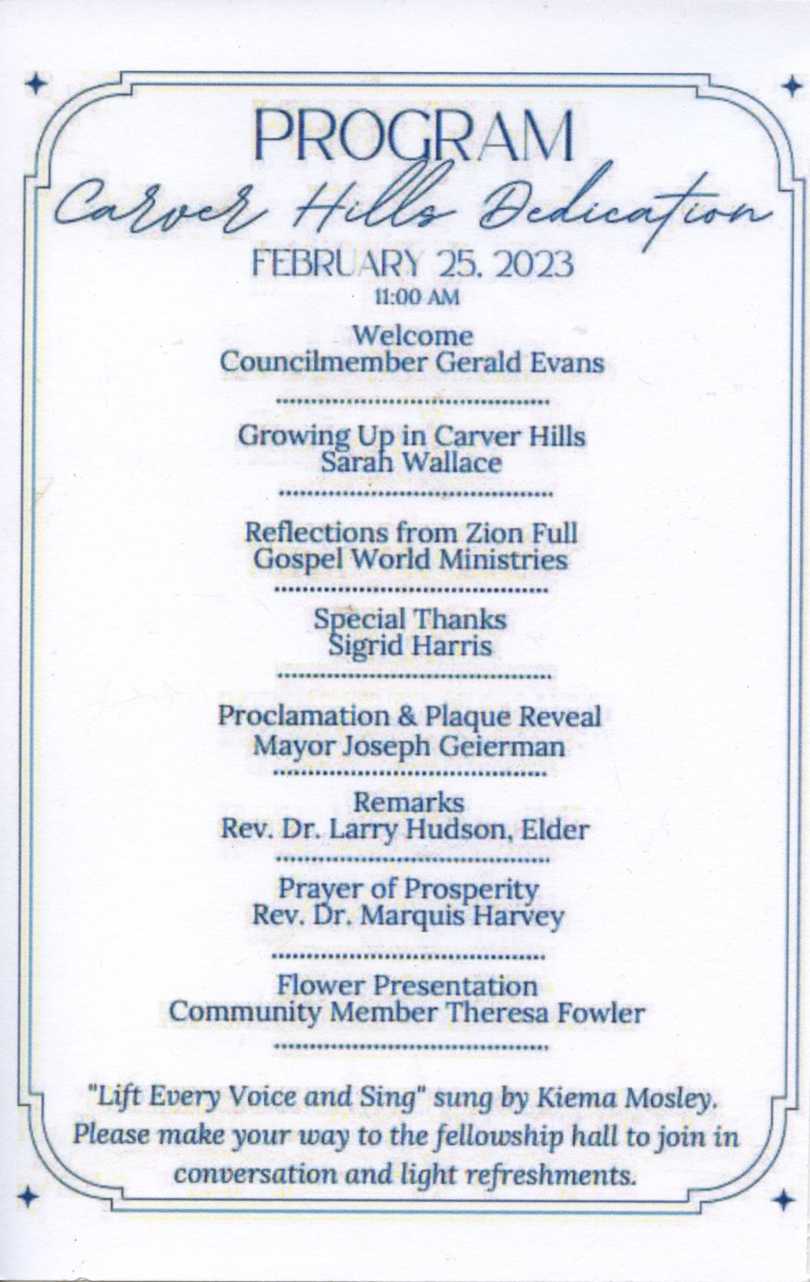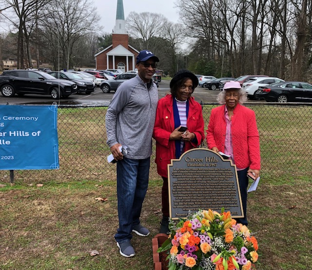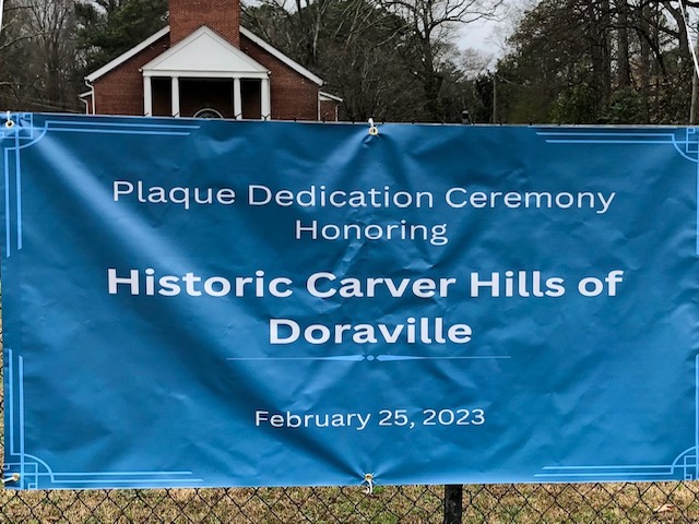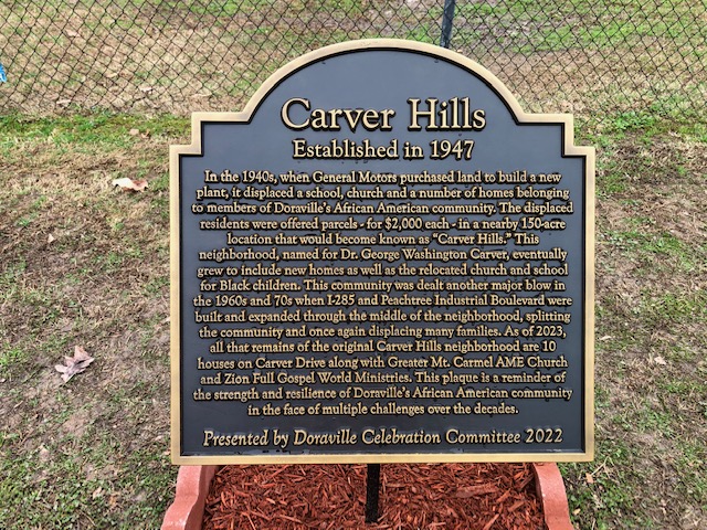 This memorial plaque was dedicated during a ceremony in February 2023. Former community members and current residents gathered to celebrate the history of Carver Hills, Doraville. Click on the links below to read reports about Carver Hills and listen to interviews from community members.